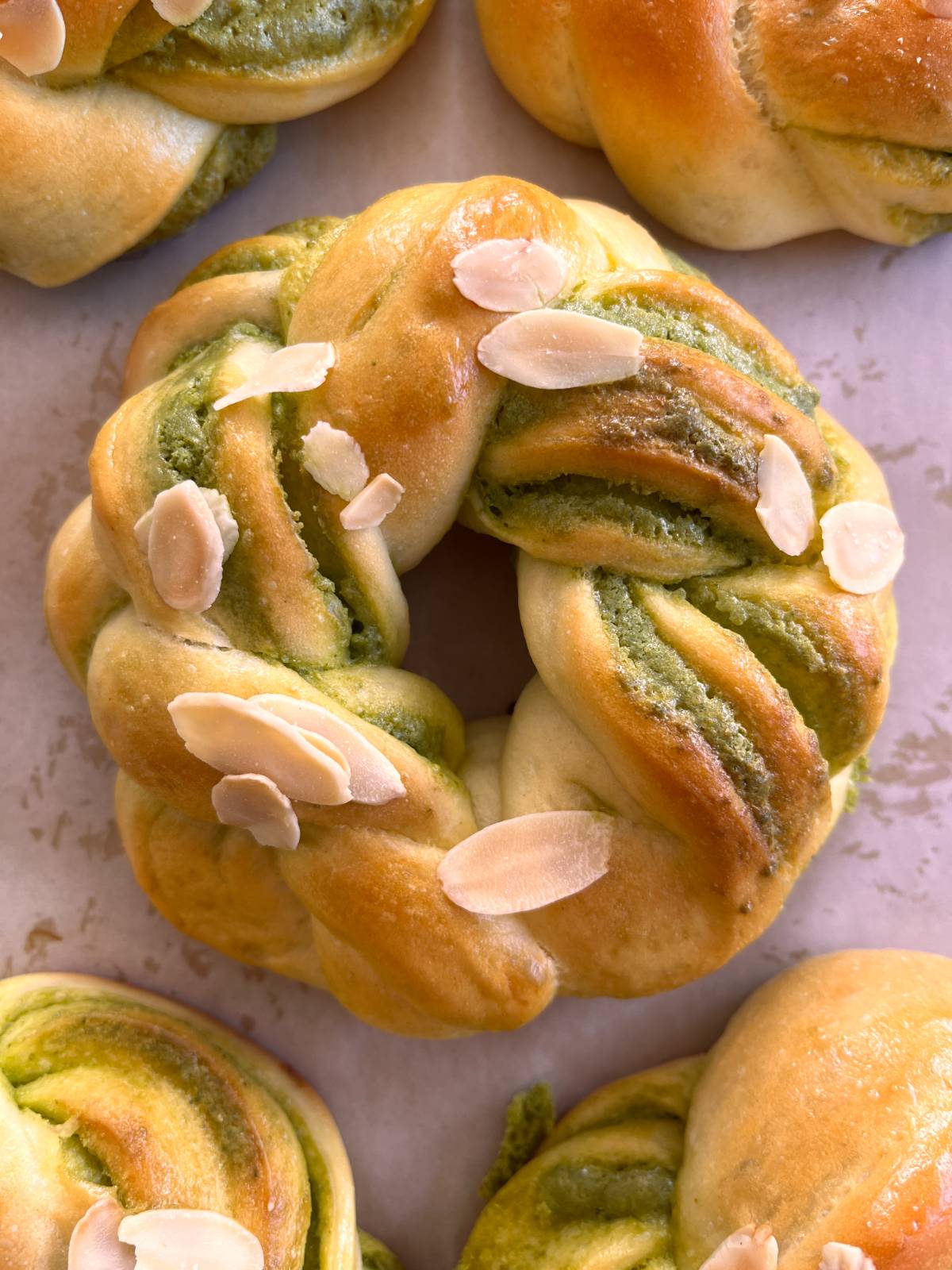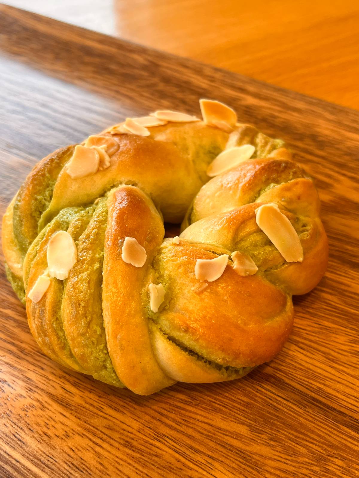 Soft, chewy matcha-flavored bread shaped in a charming ring, perfect for a delightful snack.